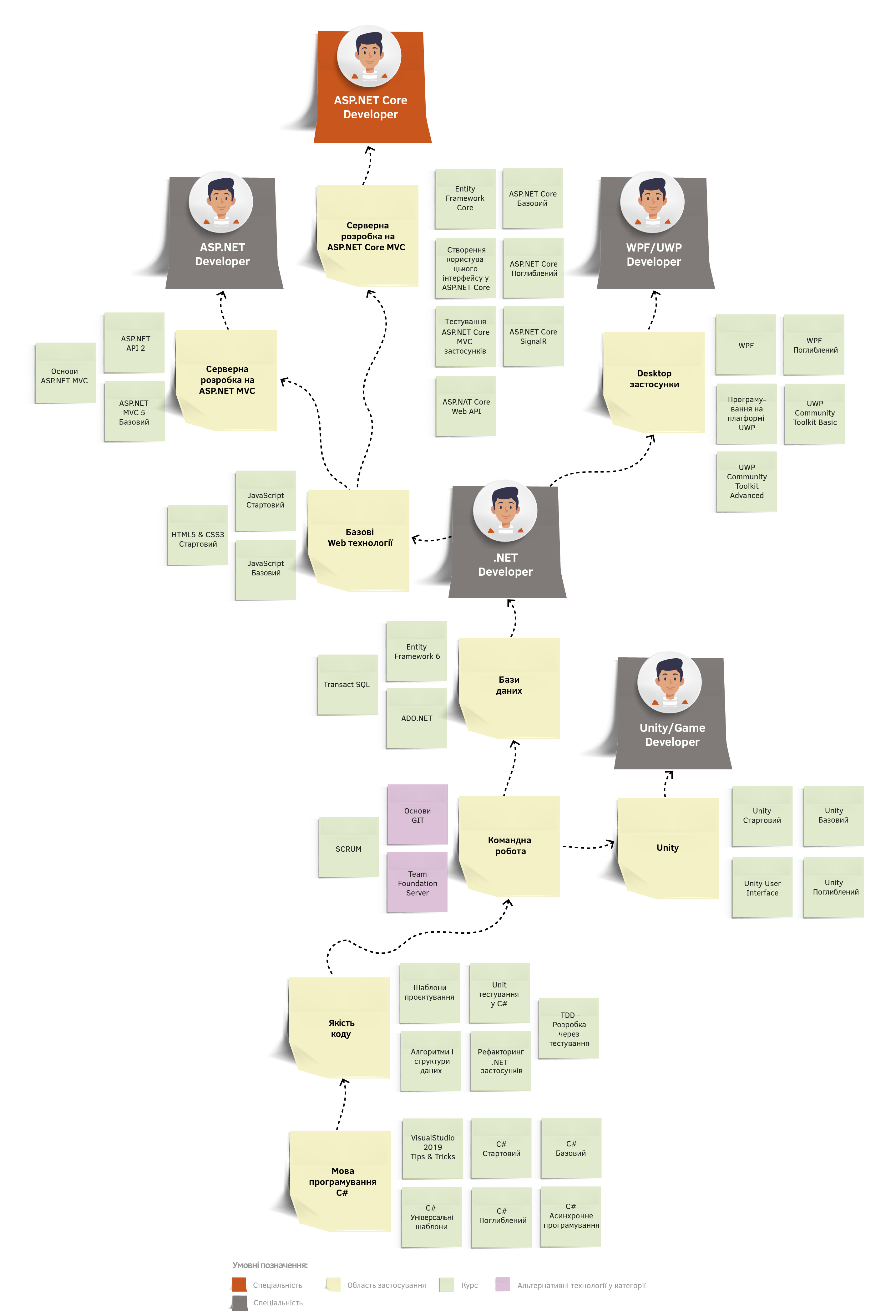 Потім починайте опанування популярних шаблонів проєктування. Після цього вам варто зосередити свою увагу на вивченні реляційних баз даних та мови запитів Transact-SQL.
